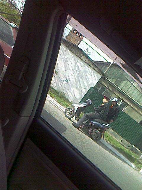 Воть, на видова перед аварийными комисарами картина такая, стоит мент и спорит с мопедистом, потом садится на мопед и пытается уехать, мопедист пытается его уболтать...